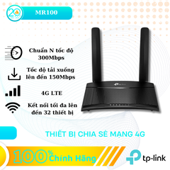 Router Wifi TPLink MR100 với thiết kế hiện đại, hỗ trợ băng tần 2.4GHz đỉnh cao, kết hợp cùng các cổng kết nối đa dạng, đồng thời cho phép bạn có thể chia sẻ 4G LTE ở bất cứ nơi nào bạn muốn với tốc độ 300Mbps, sản phẩm hướng đến hộ gia đình có đông thành viên hoặc là các doanh nghiệp vừa và nhỏ.